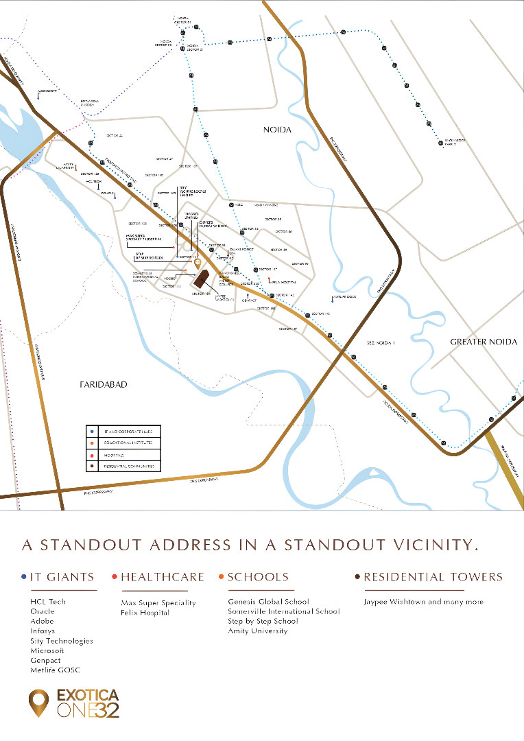 The location of Exotica One32 on the Noida–Greater Noida Expressway gives it unmatched accessibility to Delhi NCR commercial markets, including easy travel to Delhi, Greater Noida, Ghaziabad, and Gurugram. It is minutes away from the DND Flyway, Yamuna Expressway, and the upcoming FNG Expressway. Close proximity to metro stations, residential sectors, corporate parks, and educational hubs ensures workforce convenience and a stable catchment for retail and business demand.