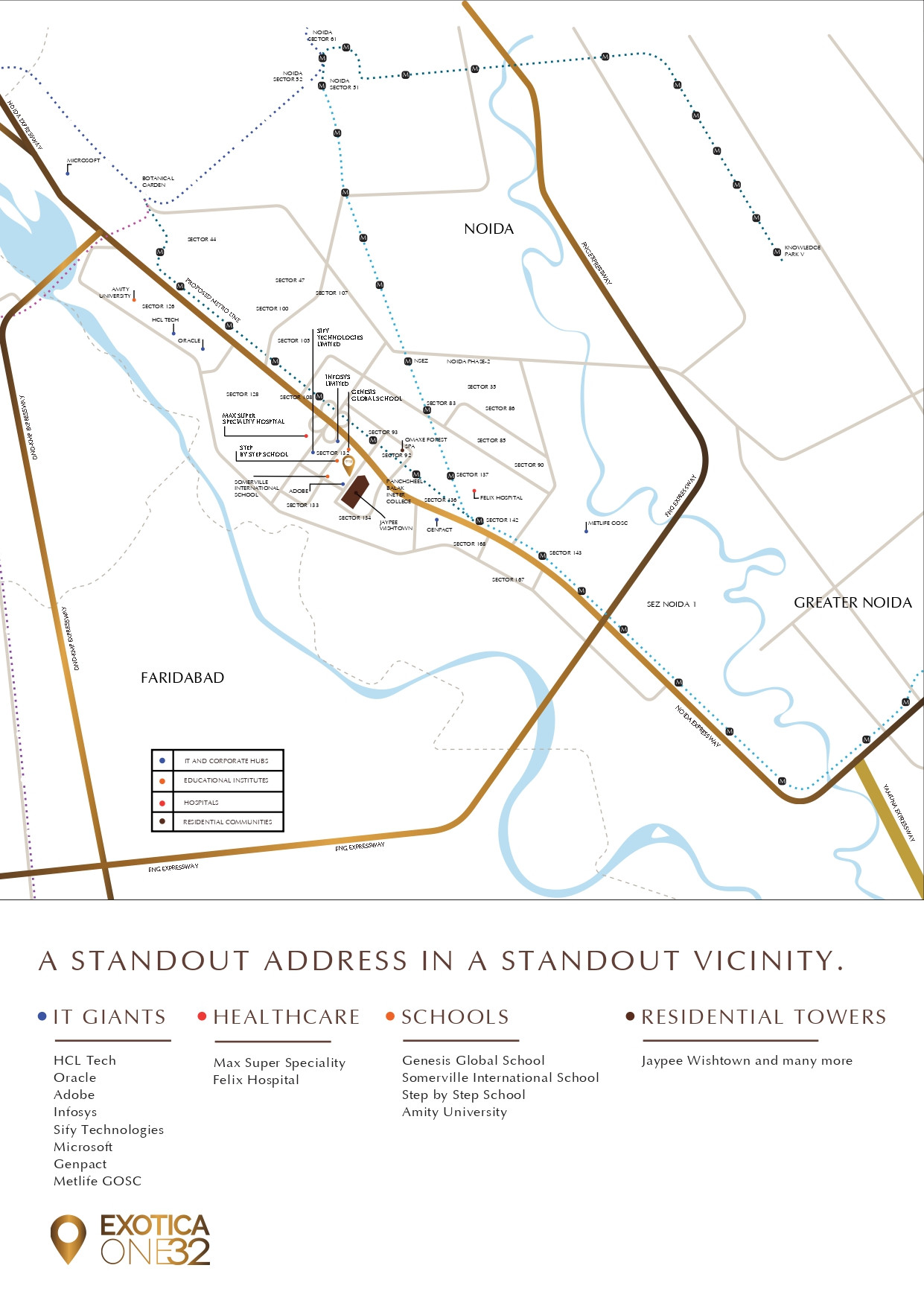 Exotica Sector 132 is situated in one of the most strategic business hubs of Noida. The Noida Expressway is home to top tech parks, multinational companies, and institutions. Its location ensures: